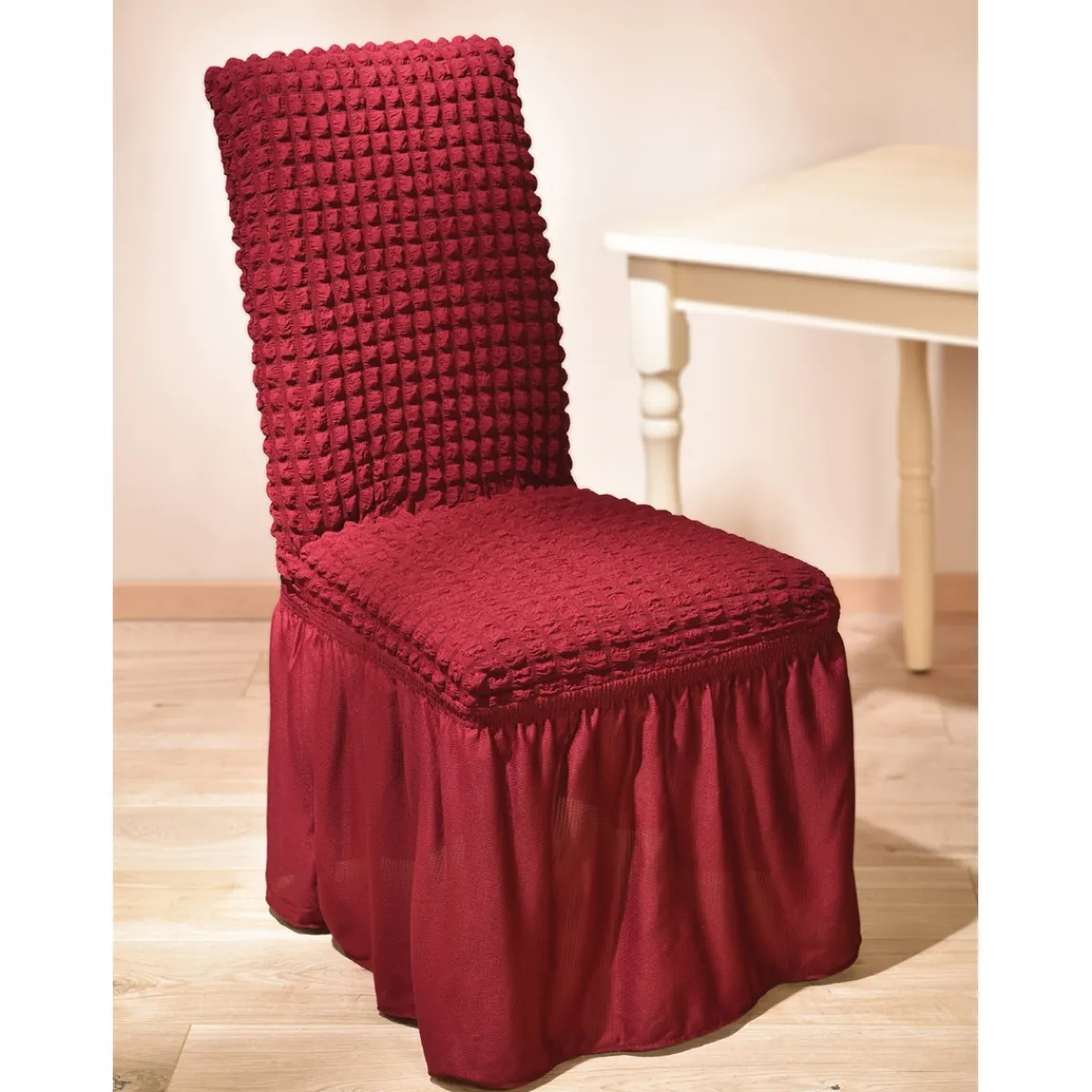 Installées en un clin d’œil sur toutes les chaises standard, ces superbes housses extensibles à volants ont un effet décoratif indéniable ! Elles seront parfaites pour rénover des chaises un peu fatiguées ou simplement les protéger des taches. Lot de 4. 98% polyester, 2% élasthanne. Lavables en machine. Dim. : dossier 50 x 35 cm, assise 31 x 35 cm.