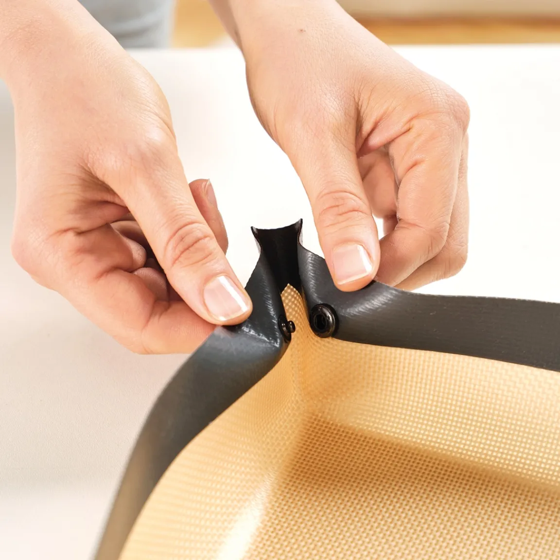 Ces feuilles de cuisson en silicone sont idéales pour la cuisson de vos préparations culinaires : frites, cookies, sablés, feuilletés, biscuits roulés… Mais elles peuvent également se transformer en véritable plat, grâce à leurs côtés fermés par boutons pression !