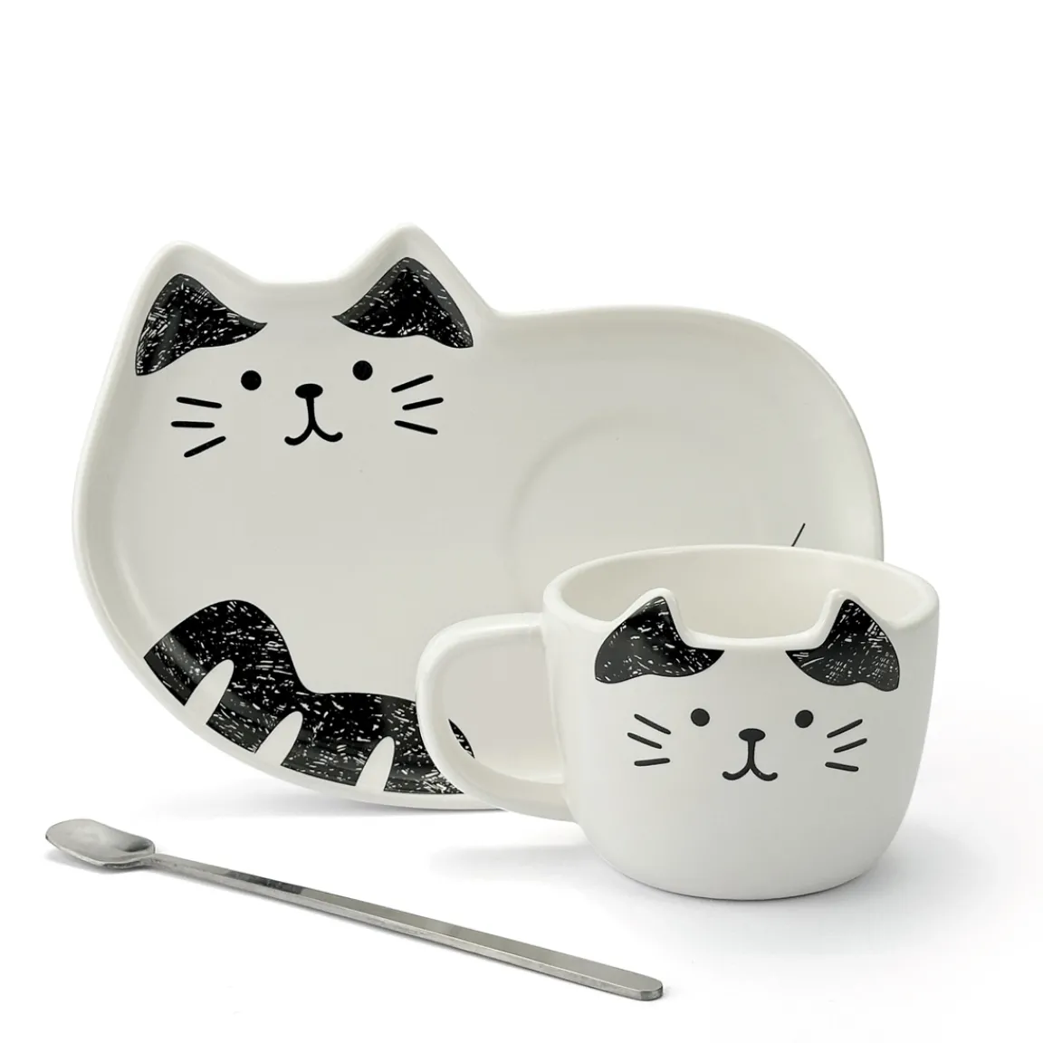 Tasse + assiette + cuillère : De la vaisselle « chat », pratique et décorative