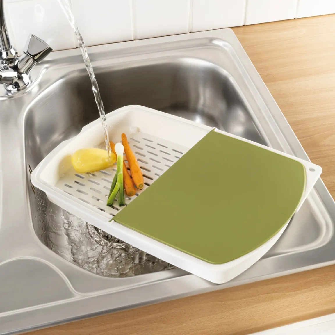 Astucieux, cet ustensile 3 en 1 va simplifier vos préparations culinaires ! Il est doté d’une planche à découper amovible, d’un égouttoir et d’un récipient pour récupérer les aliments ou les épluchures.