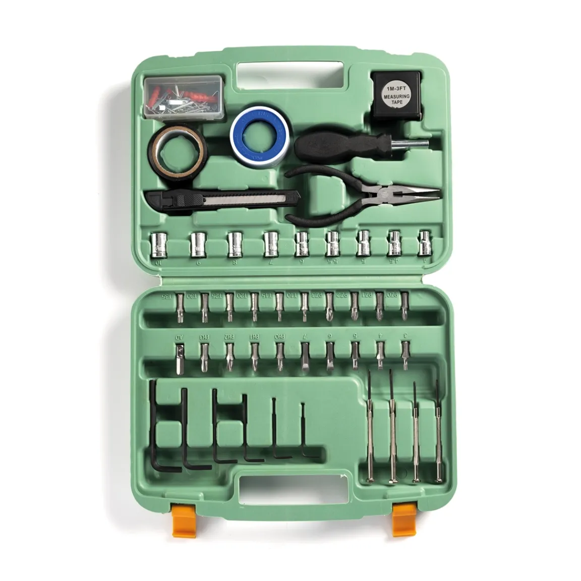 1 boîte de rangement, 1 boîte avec 55 accessoires, 1 mètre, une poignée avec 29 embouts, 4 tournevis de précision, ruban d’étanchéité, ruban isolant, cutter, pince, 6 clés hexagonales.