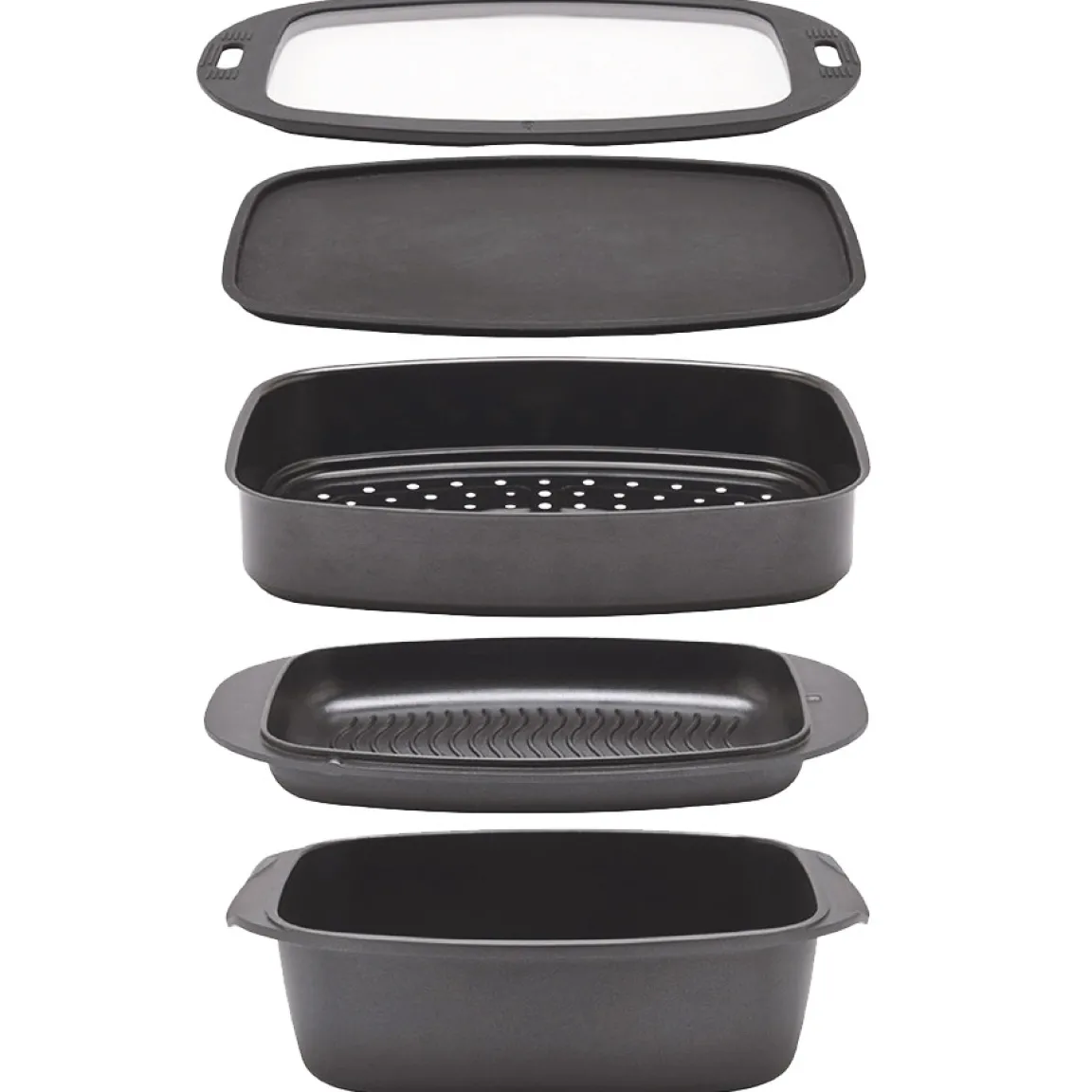 Pack : 1 couvercle en verre : 39,2 x 22,4 cm, 1 plaque en silicone : 32,5 x 21,2 cm, 1 panier vapeur en aluminium : 34 x 22,5 x 6,5 cm, 1 plat Grill : 39,2 x 22,2 x 4,3 cm (capacité : 3,1 L) , 1 plat à four avec fond induction : 40,5 x 22 x 11 cm (capacité : 8,4 L)