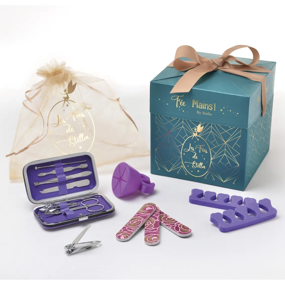 Vous y trouverez une élégante pochette en organza comprenant : 3 jolies limes à ongles, 1 support vernis, 2 écarteurs d’orteils et un set de manucure complet (2 coupe-ongles, 1 paire de ciseaux, 1 pince à épiler, 2 repousse-cuticules, 1 lime).