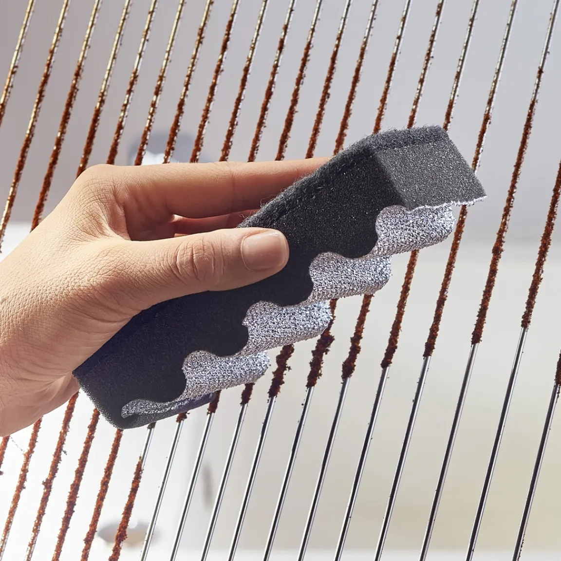 De forme ergonomique et maniable, cette éponge est pensée pour passer entre les grilles de cuisson.