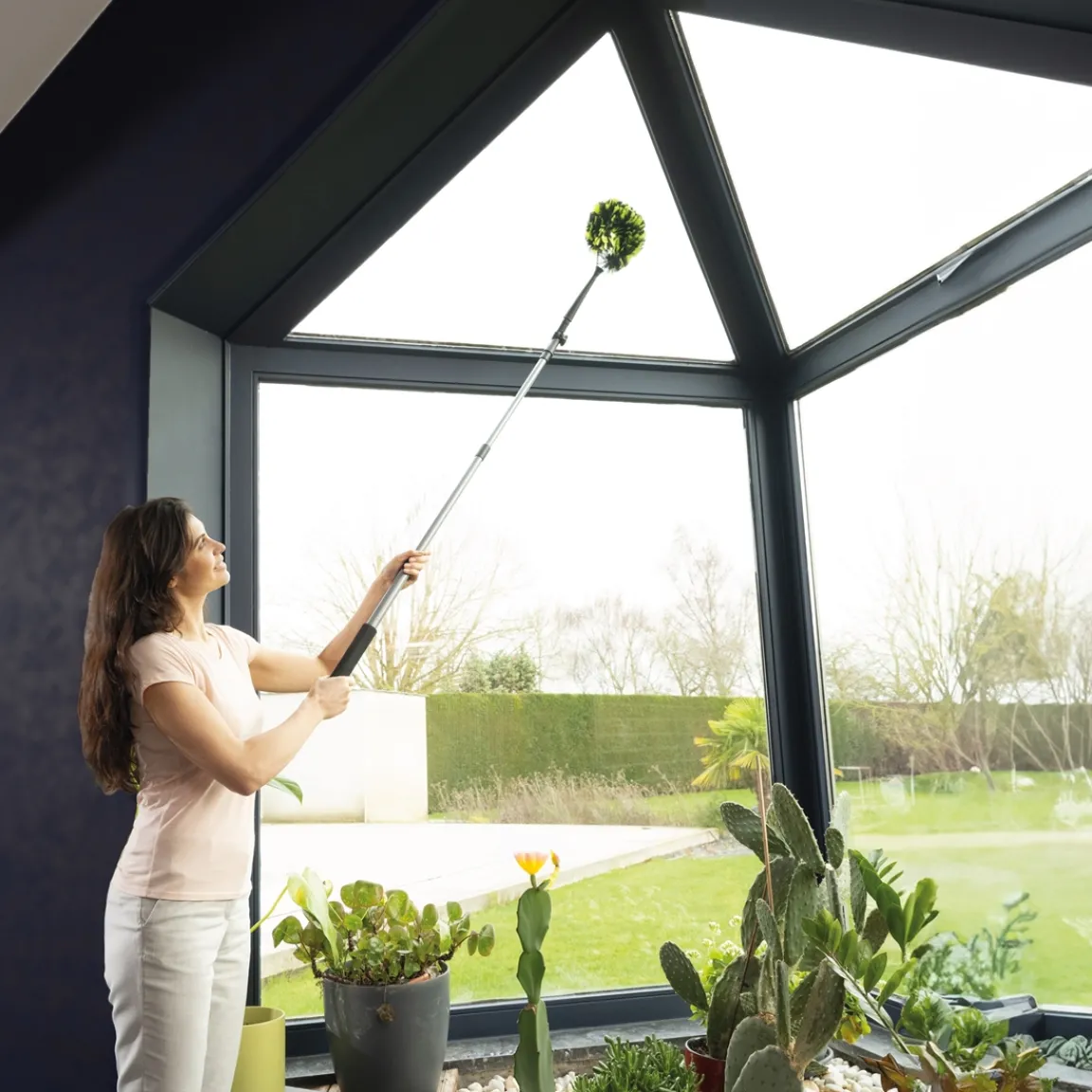 Cette brosse comprend une poignée extra longue (16,5 cm) pour accéder aux endroits difficiles d’accès et un manche télescopique ultra léger avec coude articulé (réglable jusqu’à 90°), pour atteindre le haut des murs, le plafond, le dessus des armoires, la cage d’escalier, le toit des vérandas, etc…