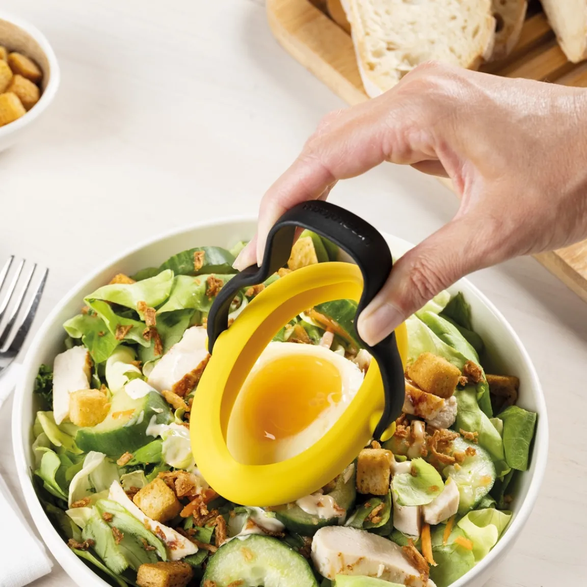 Ce cuit-œufs révolutionne la cuisson et le service de vos œufs ! Grâce à son design astucieux en forme d’anneau, il maintient parfaitement l’œuf dans la poêle. Une fois cuit, vous pouvez facilement le retourner ou le servir. Une simple pression sur la poignée, et l’œuf glisse délicatement dans votre assiette sans se casser. Sa poignée résistante à la chaleur assure une prise en main sûre, et pivote même à 360° pour une cuisson homogène des deux côtés si vous le souhaitez. En silicone et polyamide. Dim. 10 x 8,5 cm. Passe au lave-vaisselle. Lot de 2.