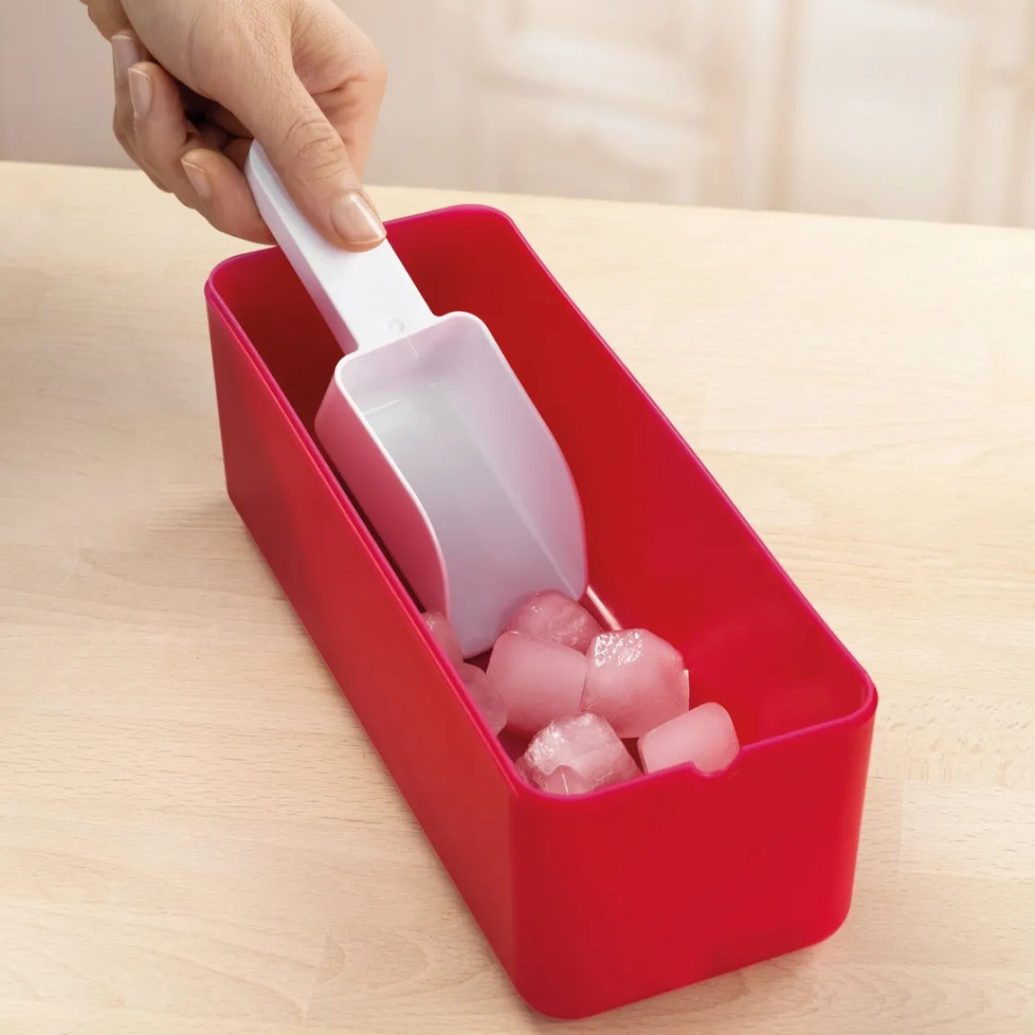 Astucieux, ce moule à glaçons est doté d’une réserve. Elle permet donc de faire des glaçons, de les stocker en dessous par un système pivotant et refaire aussitôt une tournée de 12 glaçons ! Pourvue d’une petite pelle de service bien pratique.