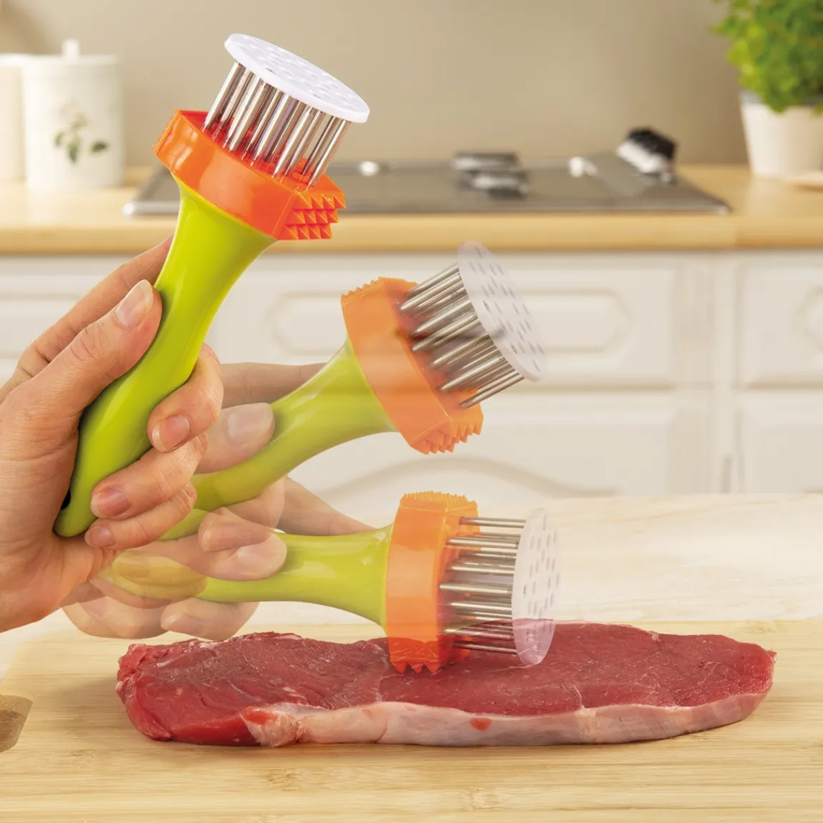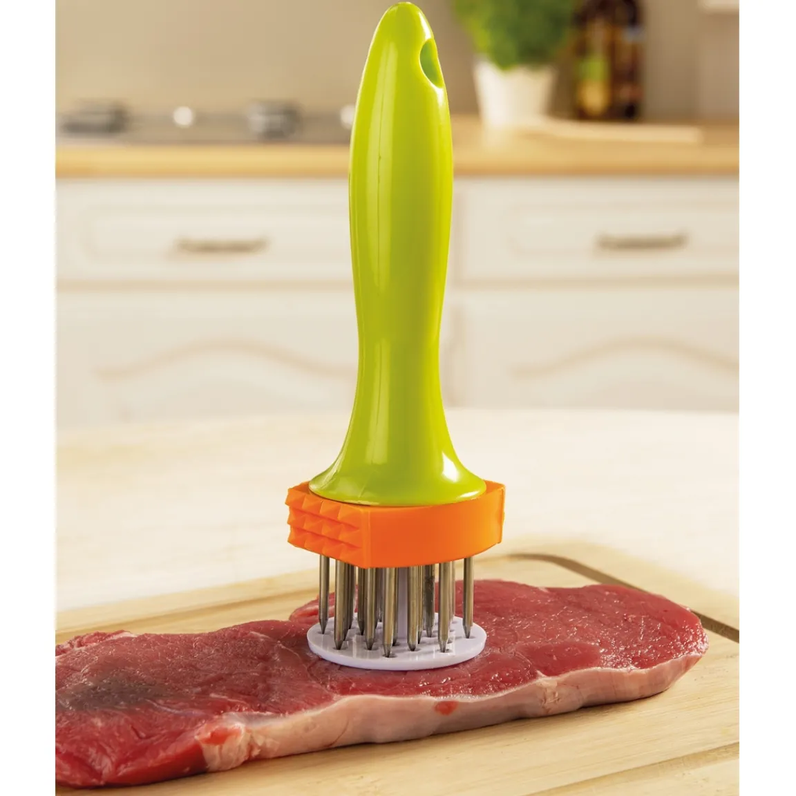 Utilisé juste avant la cuisson, l’attendrisseur sert à rendre les viandes plus digestes, tendres et faciles à mastiquer. Avec ses lames en acier, il casse la fibre de la viande, et son côté marteau permet de rendre les chairs encore plus fondantes. En matière plastique et acier inoxydable. Dimensions : 18 x 6 cm.