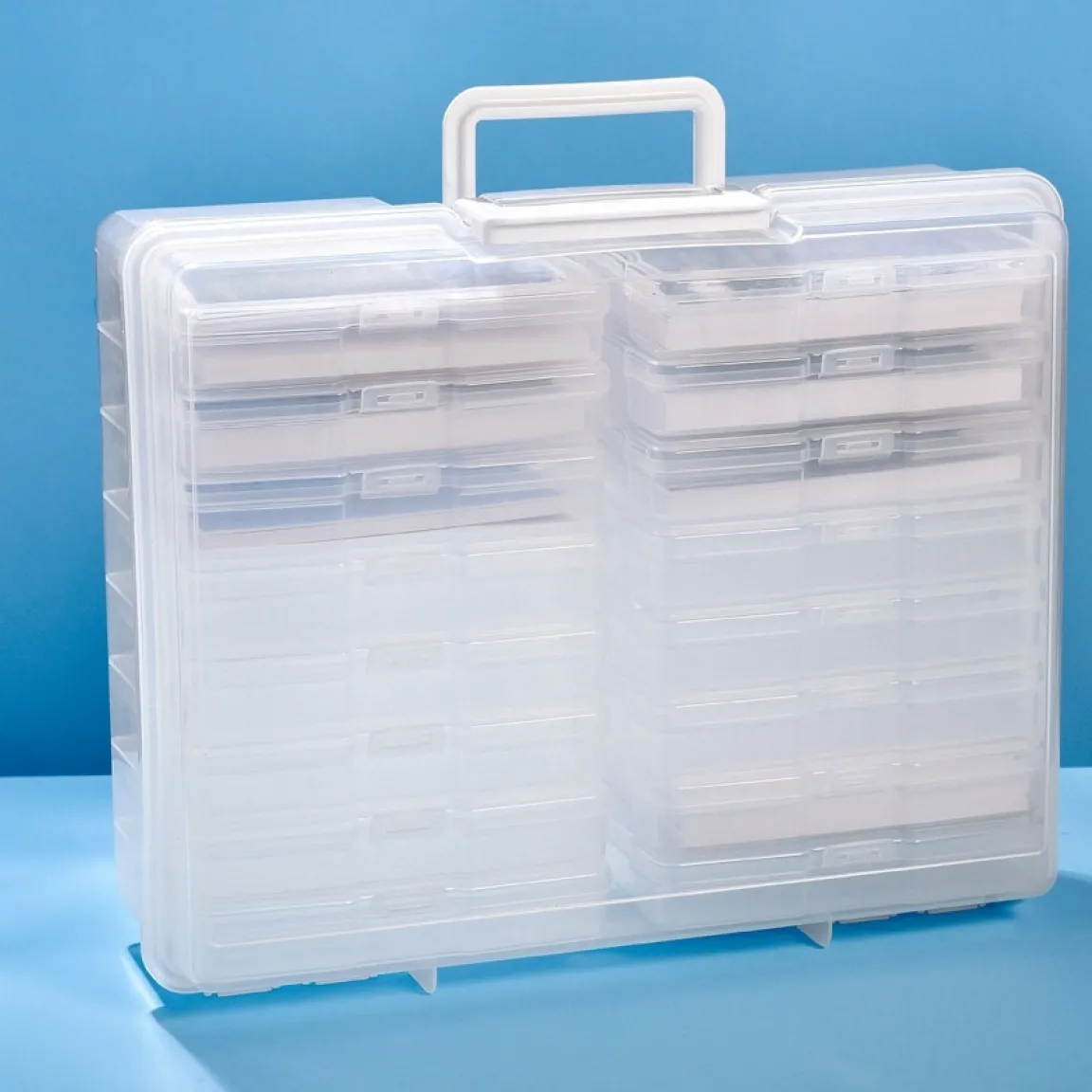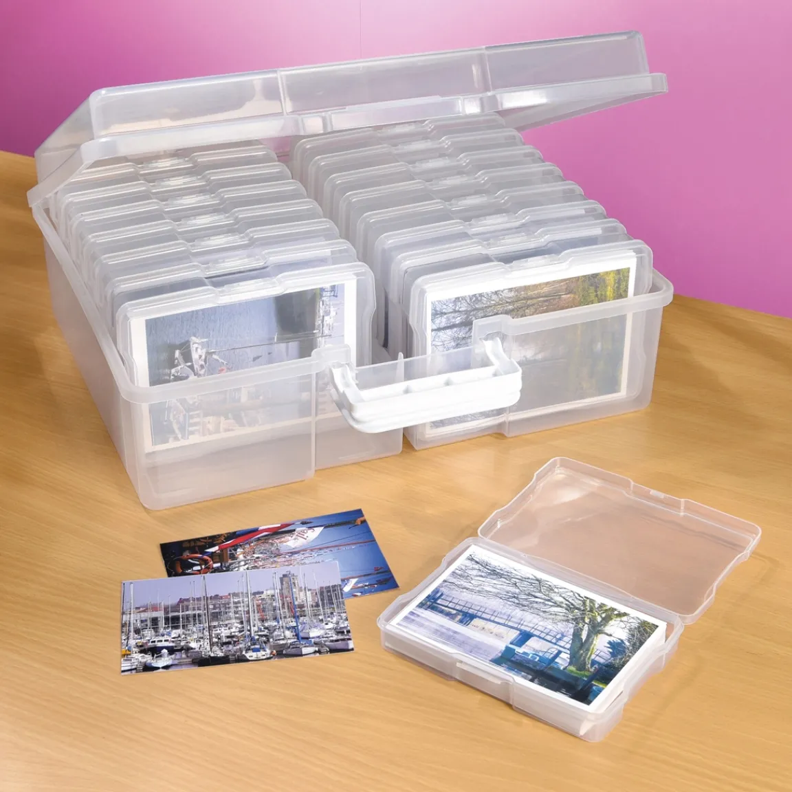 Photos de vacances, de voyage, de famille, montrant les plus beaux événements de votre vie, tout peut être grâce à cette grande boîte de rangement photos. La mallette aussi bien que les petites boîtes sont transparentes, vous pourrez ainsi retrouver facilement les clichés que vous cherchez.