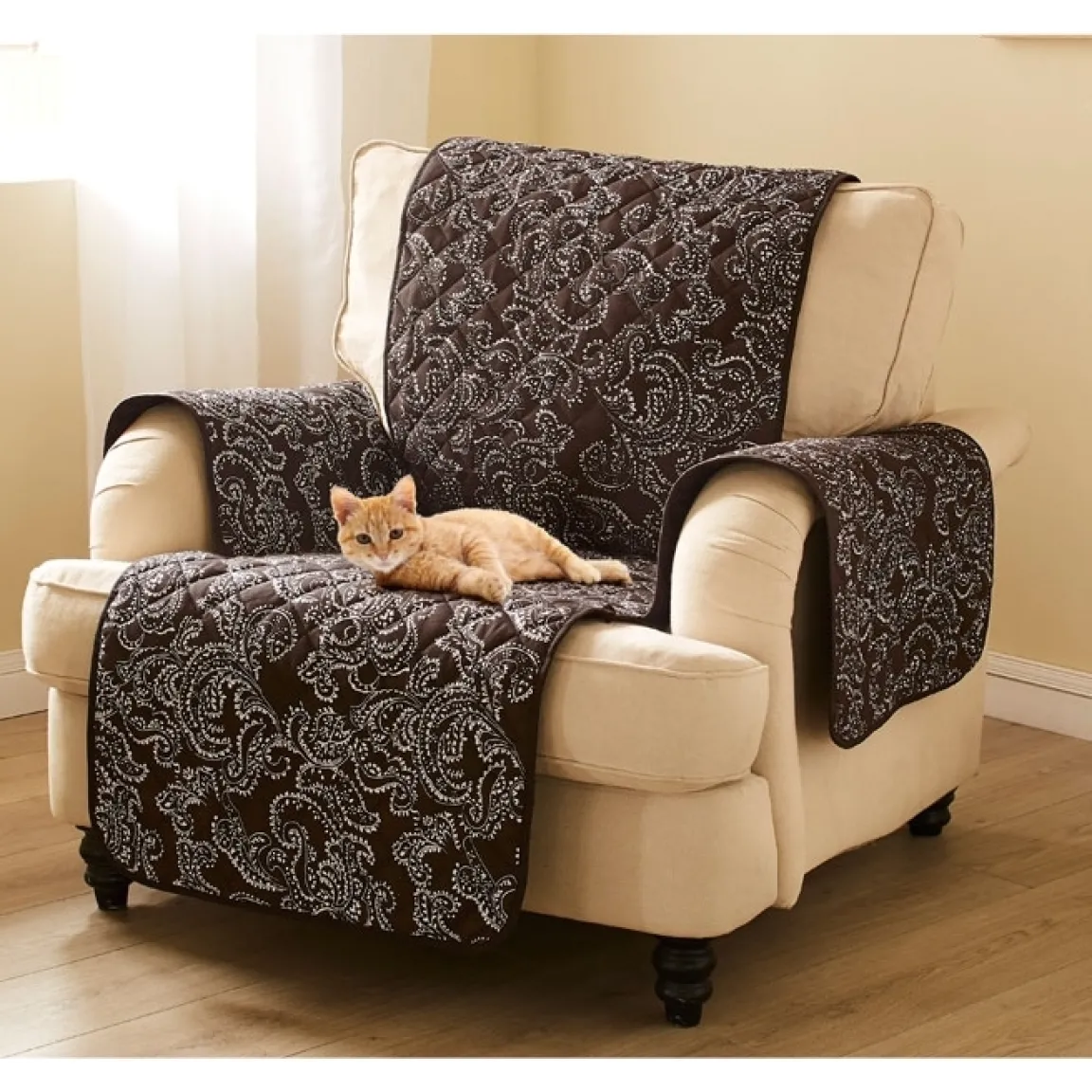 Ce protège fauteuil et canapés saura, à coup sûr, donner un nouvel élan, actuel et raffiné, à votre salon. Puisqu’il est réversible, vous aurez le choix de mettre en avant le côté imprimé cachemire où le côté uni, selon vos envies. 100% polyester, rembourrage 100% synthétique, entretien facile (passe à la machine). Existe en 3 tailles : fauteuil 186 x 135,5 cm, canapé 2 places 241,5 x 135,5 cm, canapé 3 places 298 x 135,5 cm.